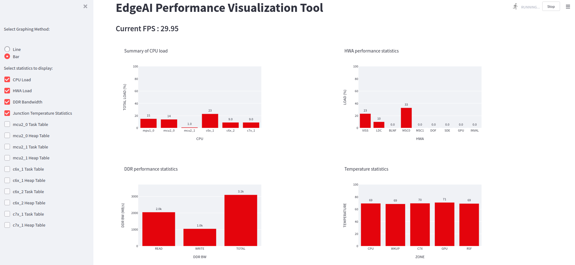 The performance visualization tool can be used to view all the performance statistics recorded when running the edge AI C++ demo application. This includes the CPU and HWA loading, DDR bandwidth, Junction Temperatures and FPS obtained. Refer to Available options for details on the performance metrics available to be plotted.