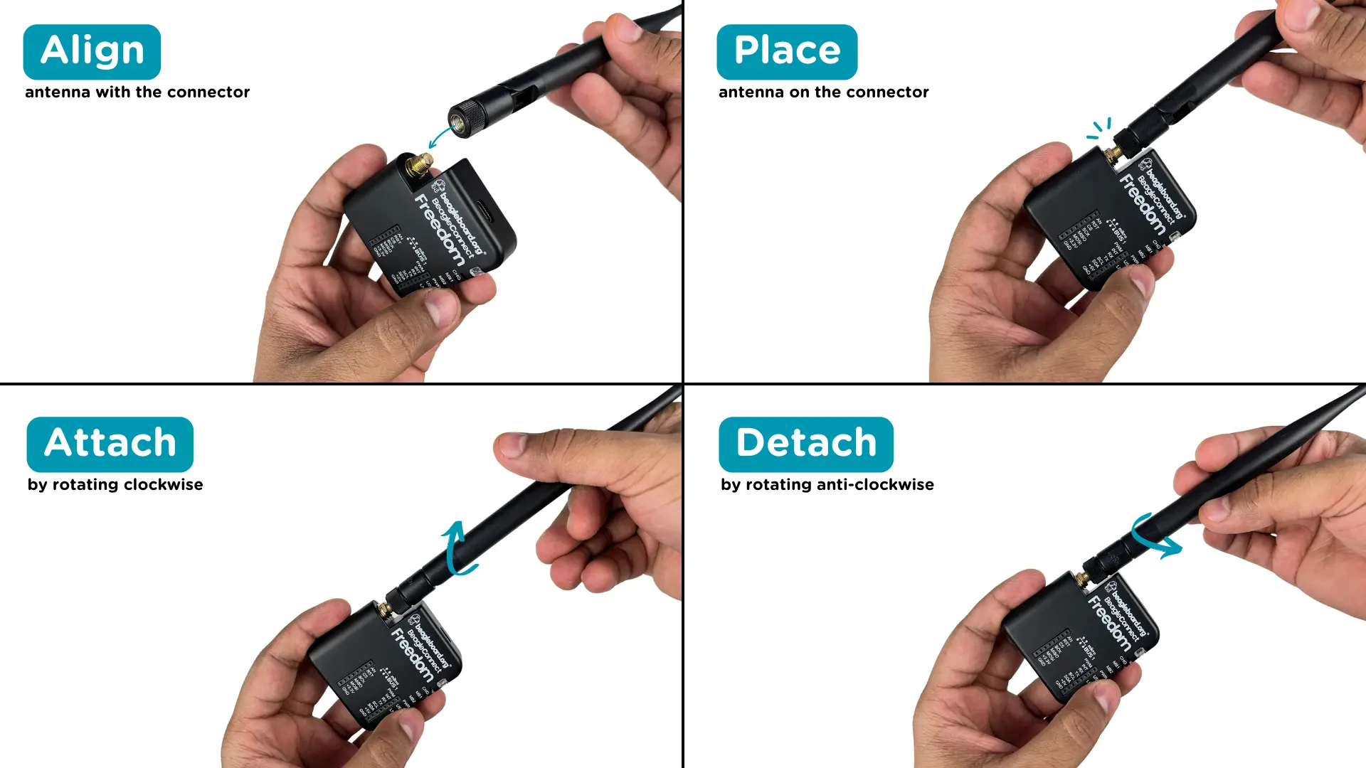 To connect the SubGHz antenna with SMA connector to the BeagleConnect Freedom you just have to align, place and rotate the antenna clockwise as shown in the image below. To detach the antenna just twist it anti-clockwise.