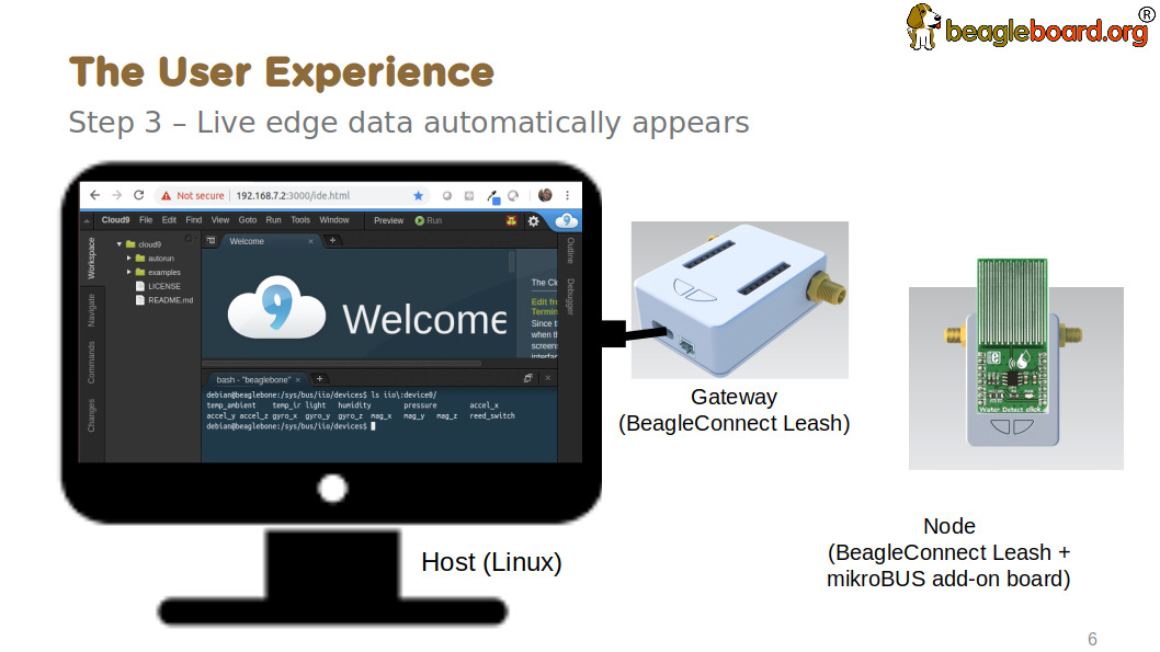 Log into a host system running Linux that is BeagleConnect™ enabled. Enable a Linux host with BeagleConnect™ by plugging a BeagleConnect™ gateway device into its USB port. You’ll also want to have a BeagleConnect™ node device with a sensor, actuator or indicator device connected.