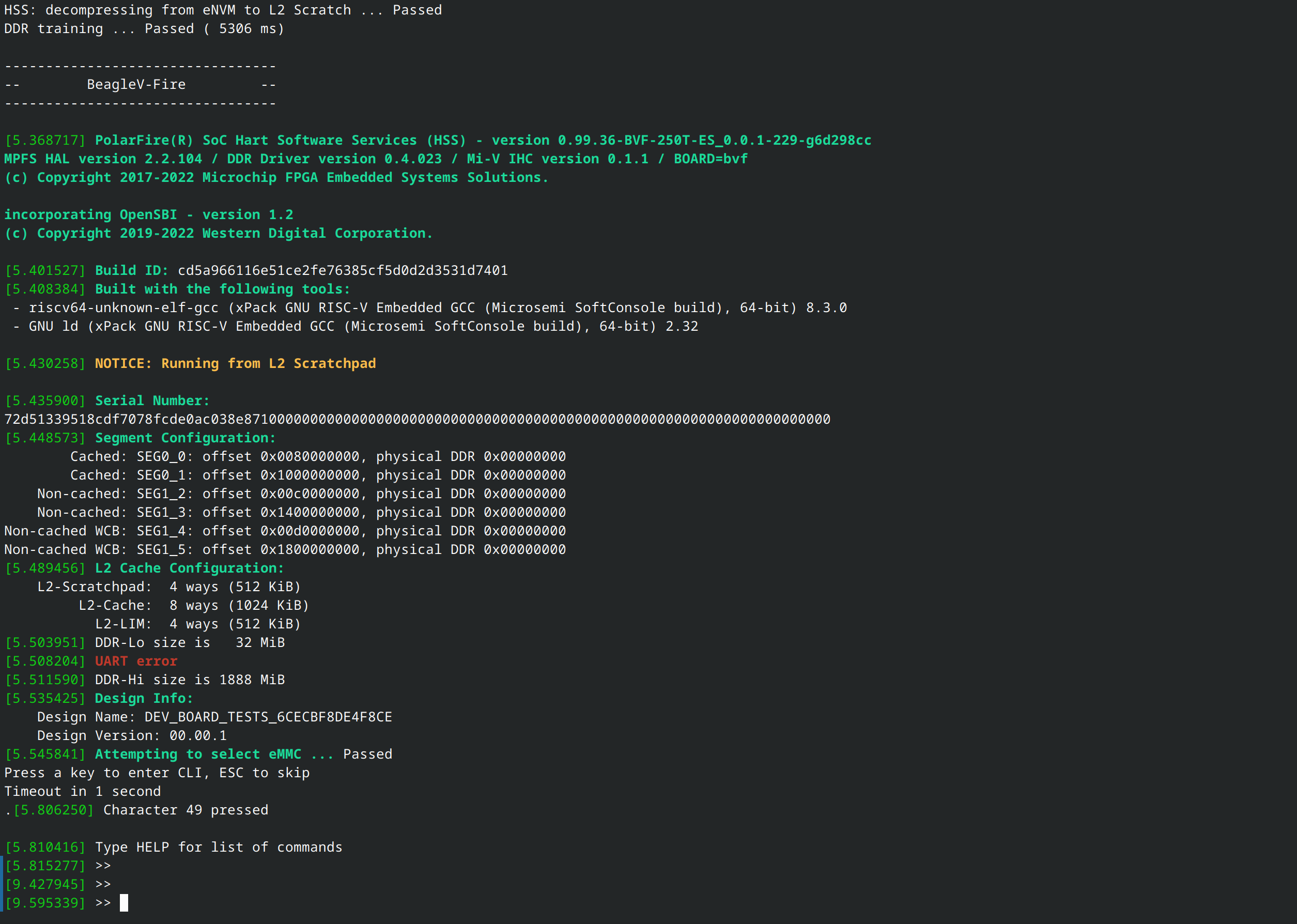 able to access Hart Software Services (HSS) prompt. BeagleV-Fire’s eMMC content is