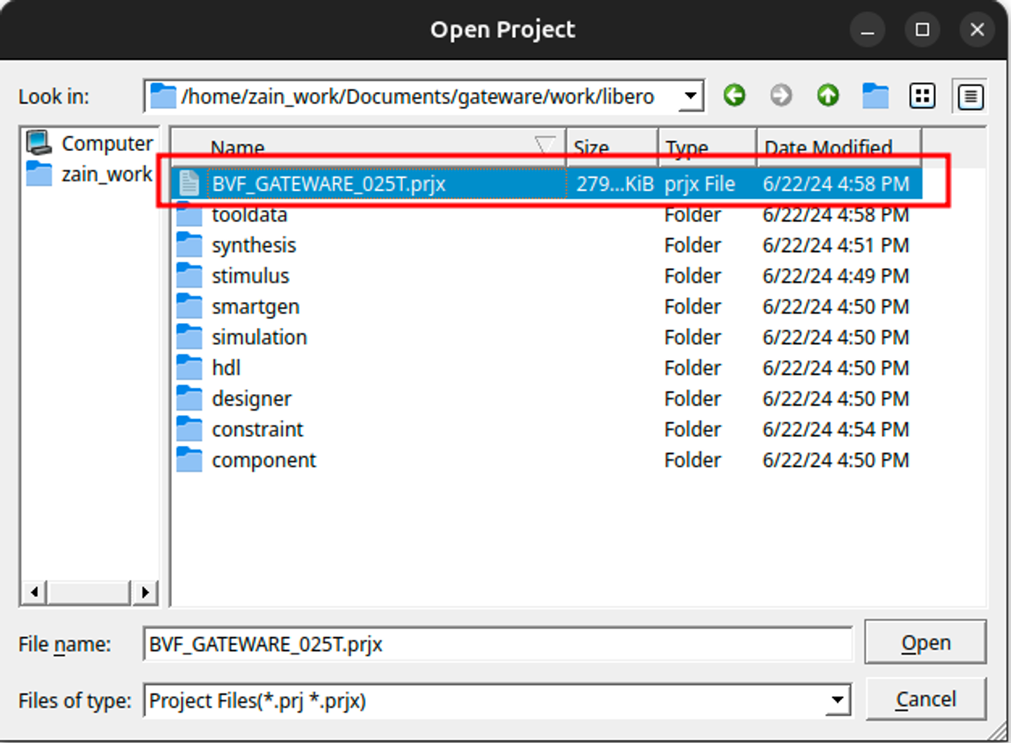 CTRL+O and selecting the generated project as gateware/work/libero/BVF_GATEWARE_025T.prjx .