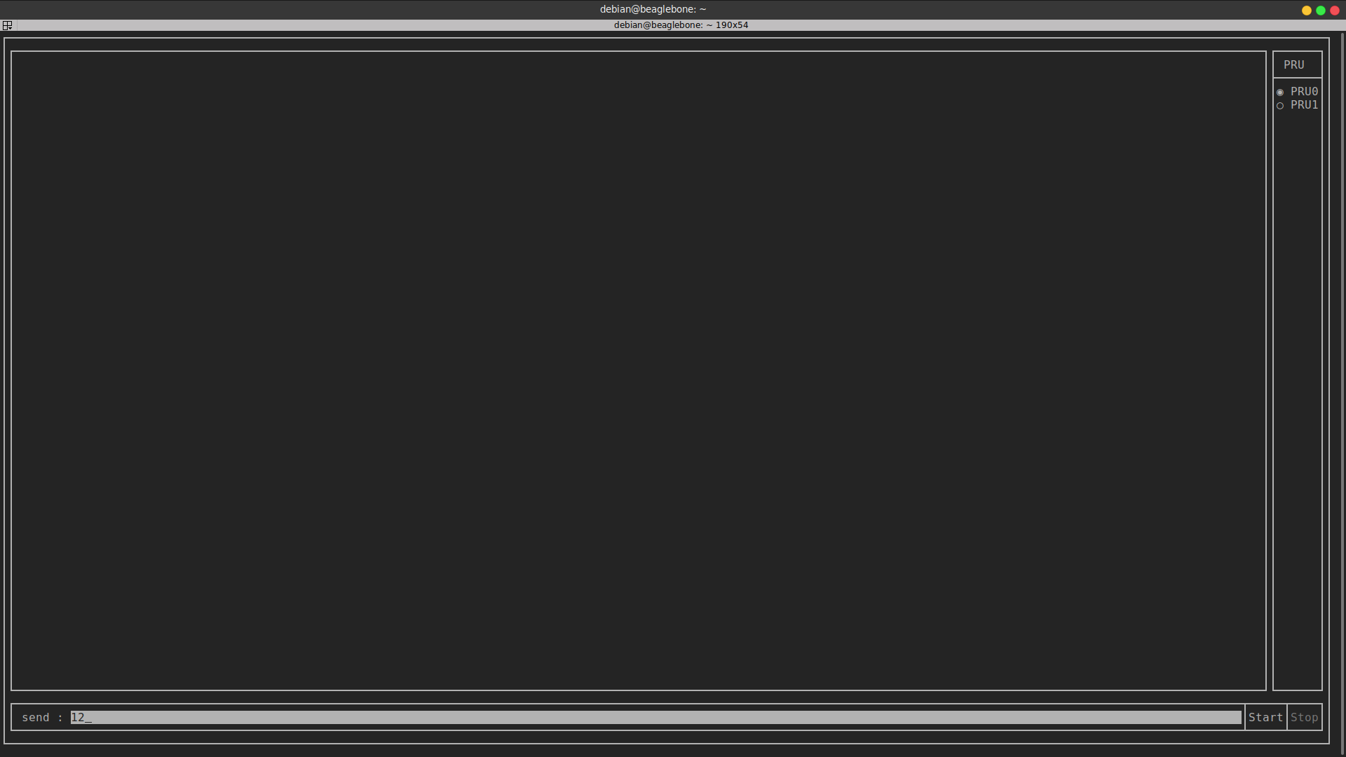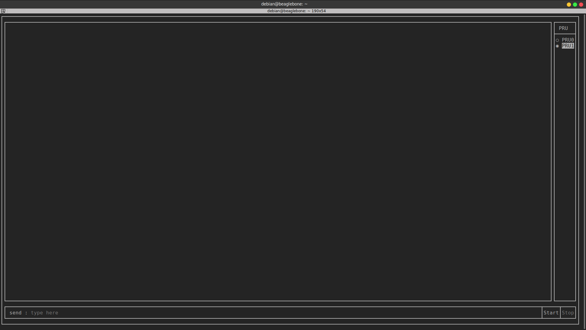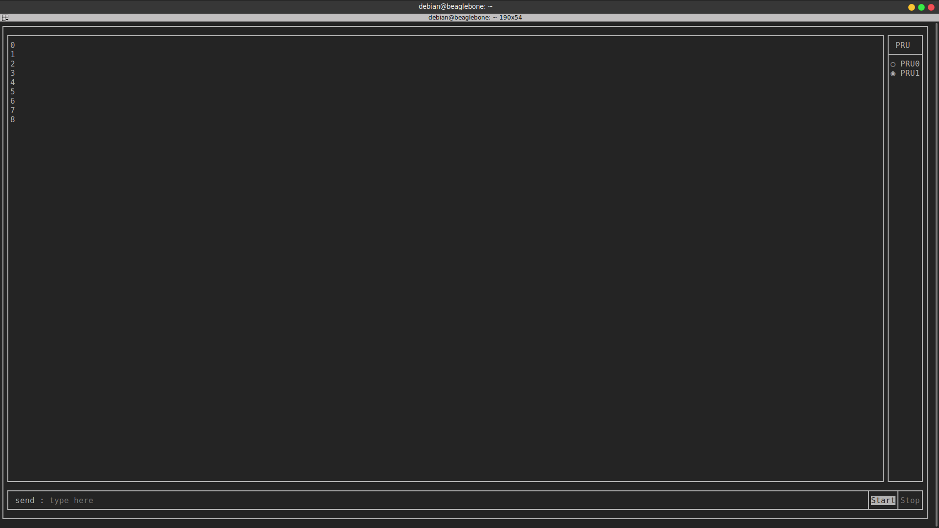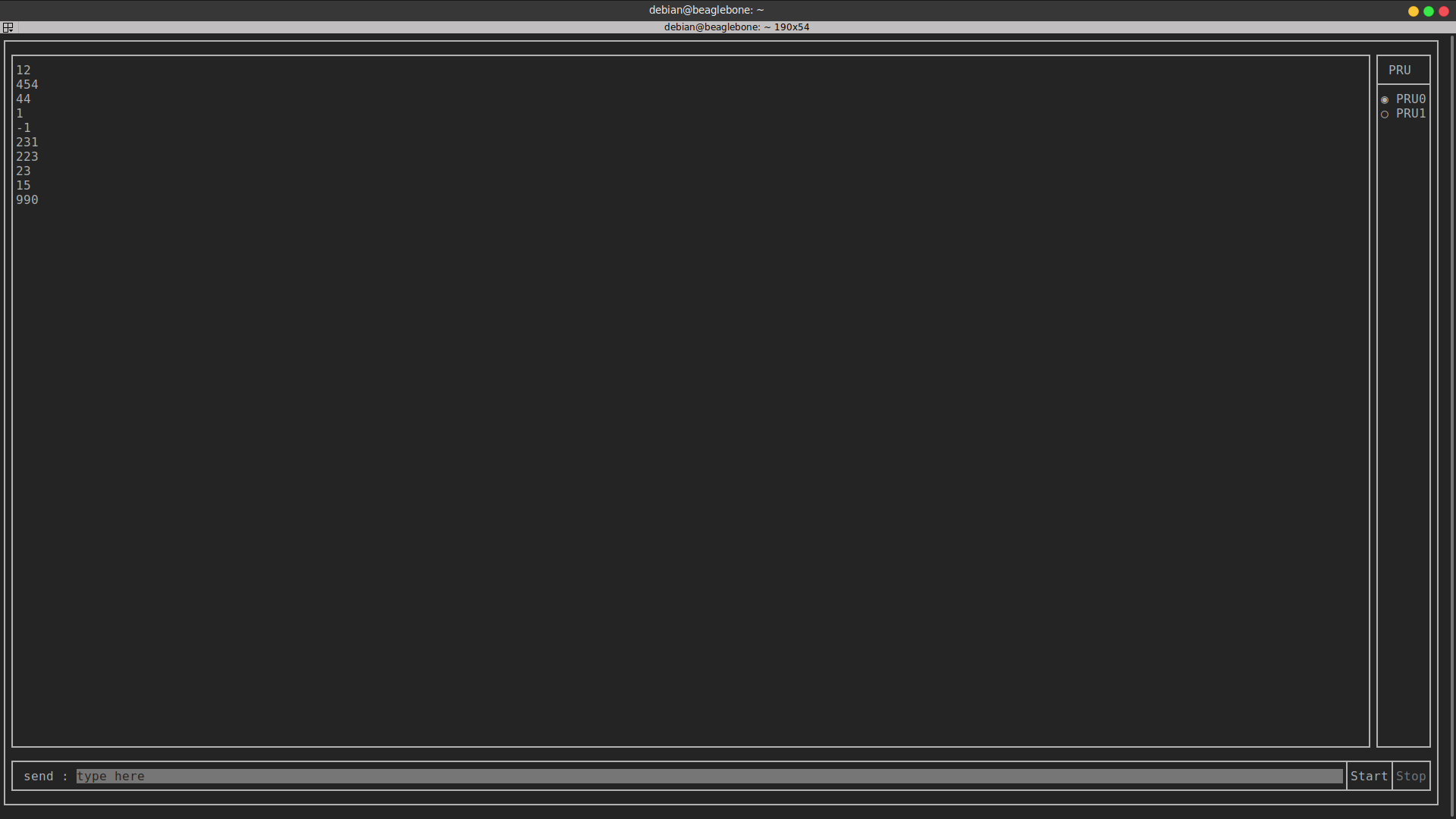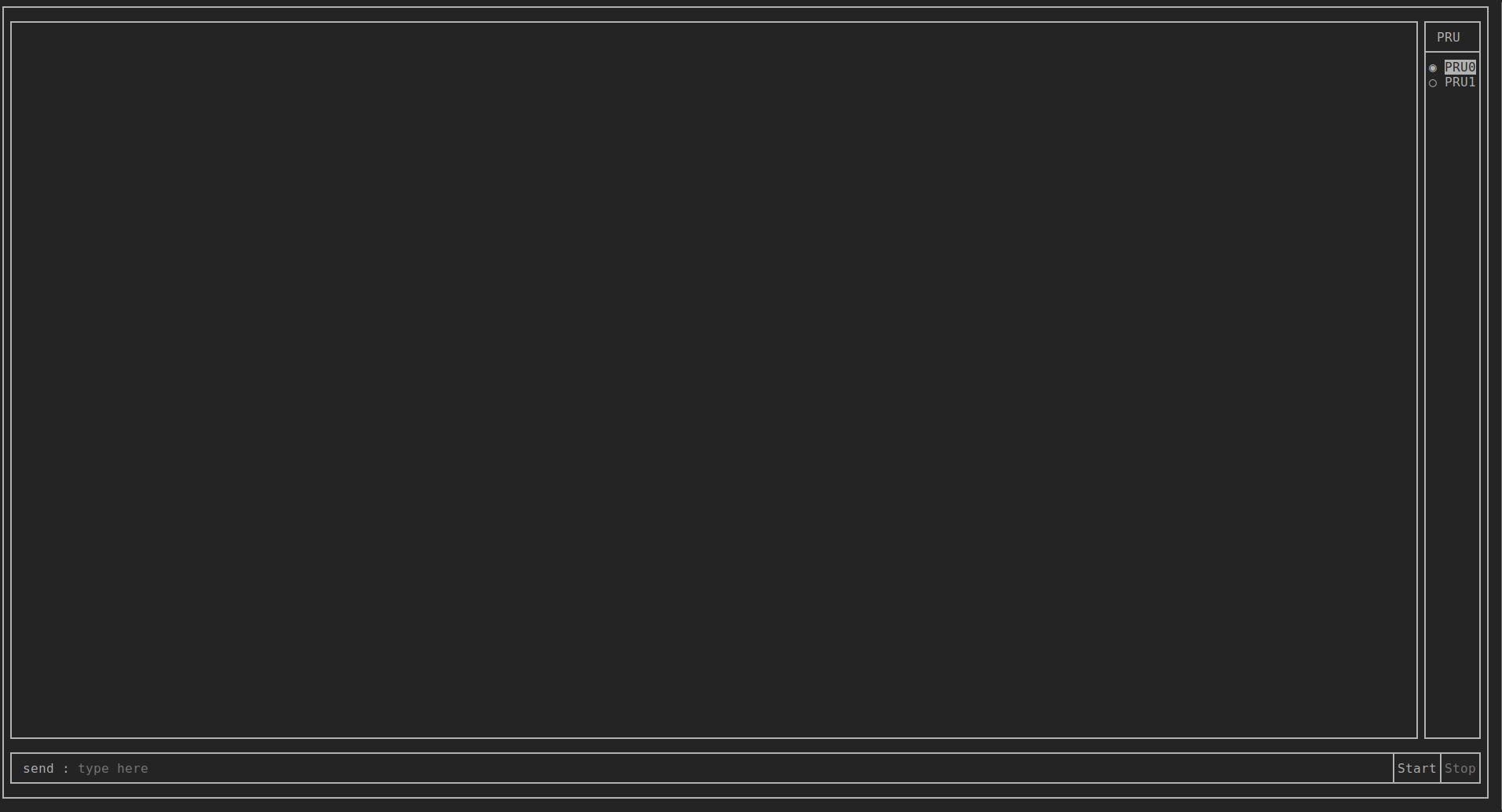 simppru-console is a console app, it can be used to send/receive message to the PRU using RPMSG, and also start/stop the PRU. It is built to facilitate easier way to use rpmsg and remoteproc API’s to control and communicate with the PRU